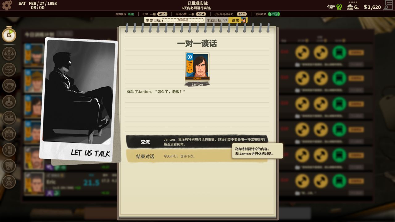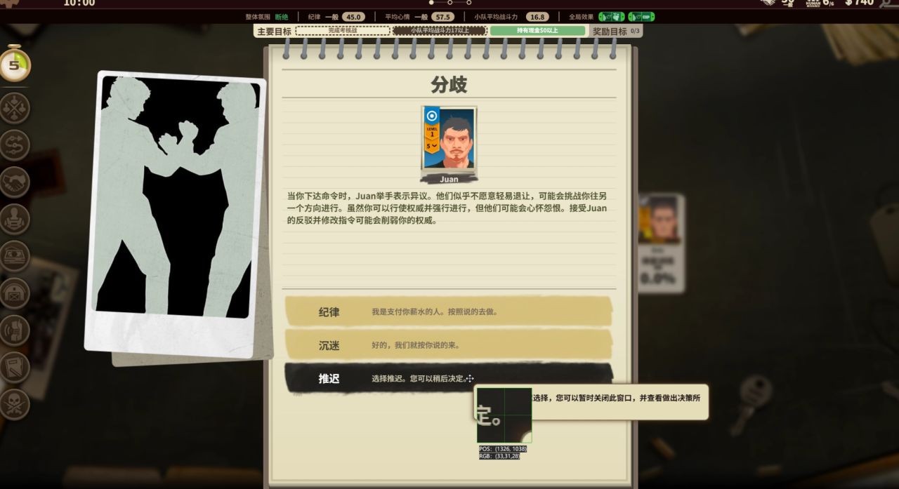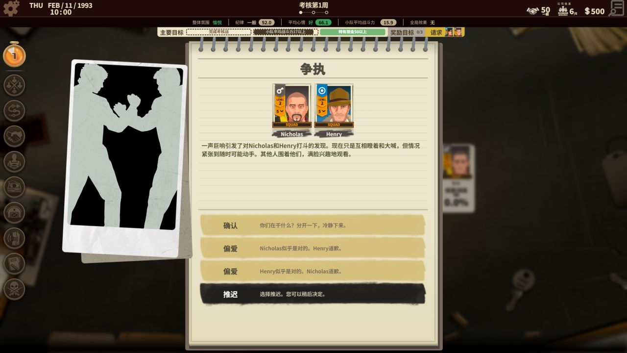 因此,在訓練過程中,你可能會遇到各種隨機事件。除了我之前提到的員工請假或意外受傷外,在鍛鍊過程中,可能還會碰到兩位情緒激動的老兄互相不滿,想要動手,或者因爲彼此的自尊而展開無意義的爭吵。面對這些社交矛盾,你需要在“紀律、中立、偏愛或推遲”這四種不同態度中做出選擇。