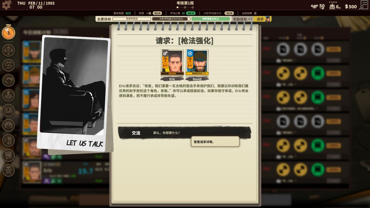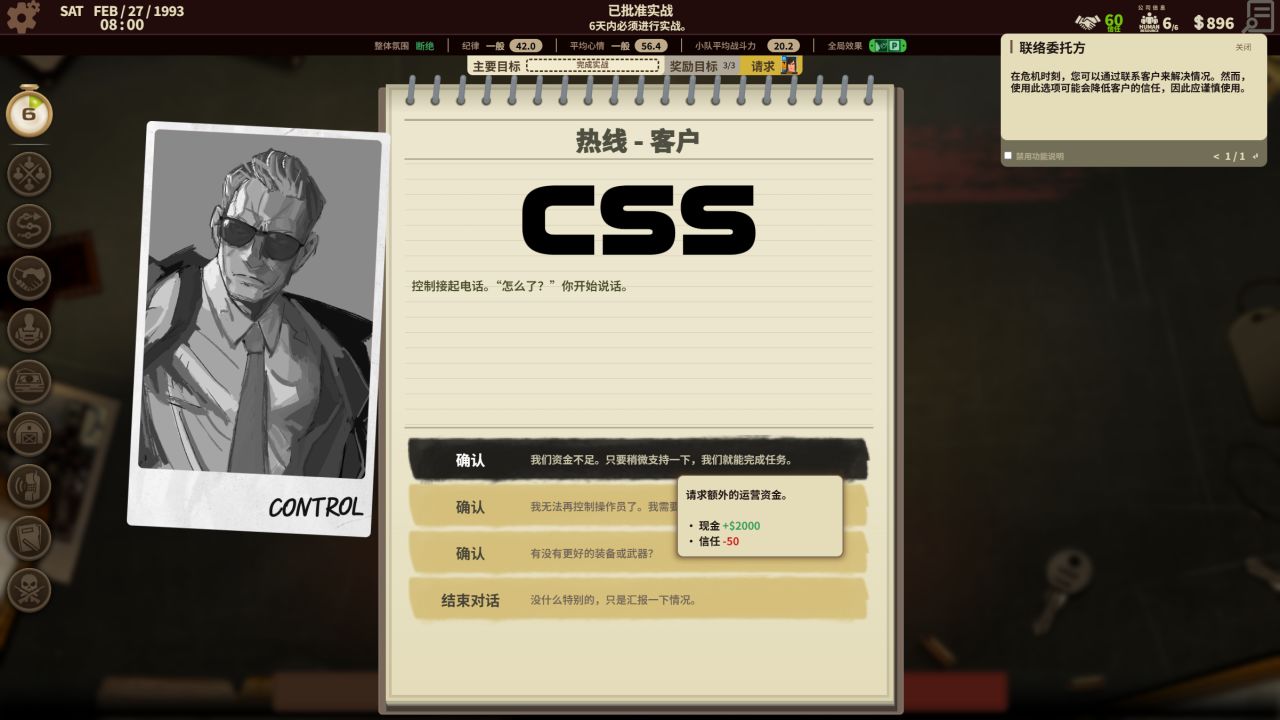 養活手下的這些兄弟們,也需要金錢成本:武器、手榴彈、防彈衣等各種裝備。然而,如果你在資金不足的情況下……可以尋求甲方爸爸申請額外的運營資金,或者請他幫助尋找更有實力的員工,甚至是武器裝備。