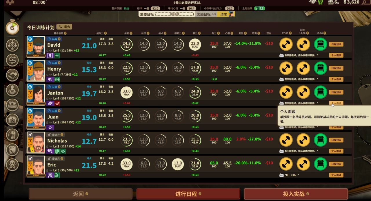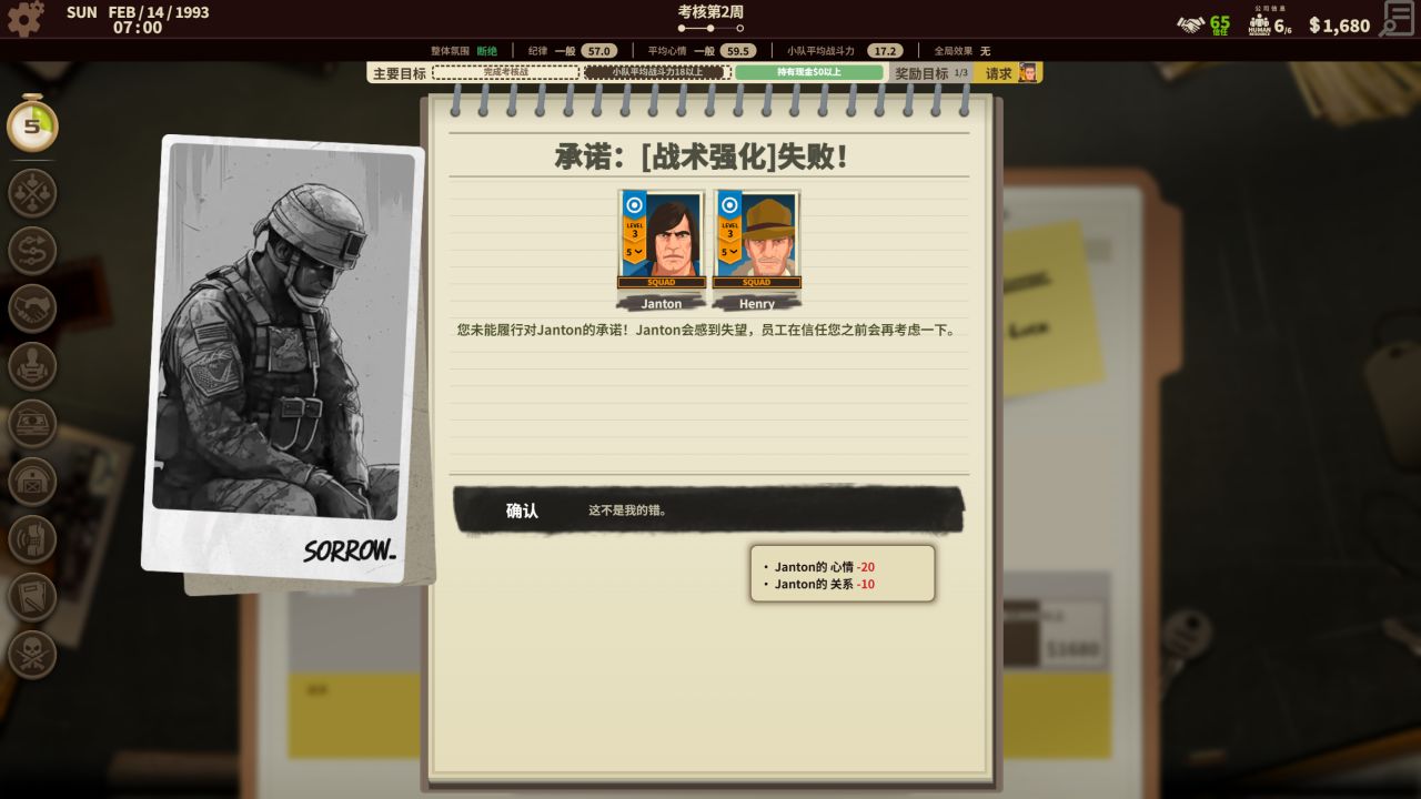 關於加訓和任務提案等需求,這些都是額外的附加任務。如果能夠完成,這將大大提升他們的滿意度和士氣。然而,如果未能履行承諾,他們可能會認爲作爲老闆的你缺乏能力、沒信譽,從而導致士兵們感到失望(降低心情和關係)。