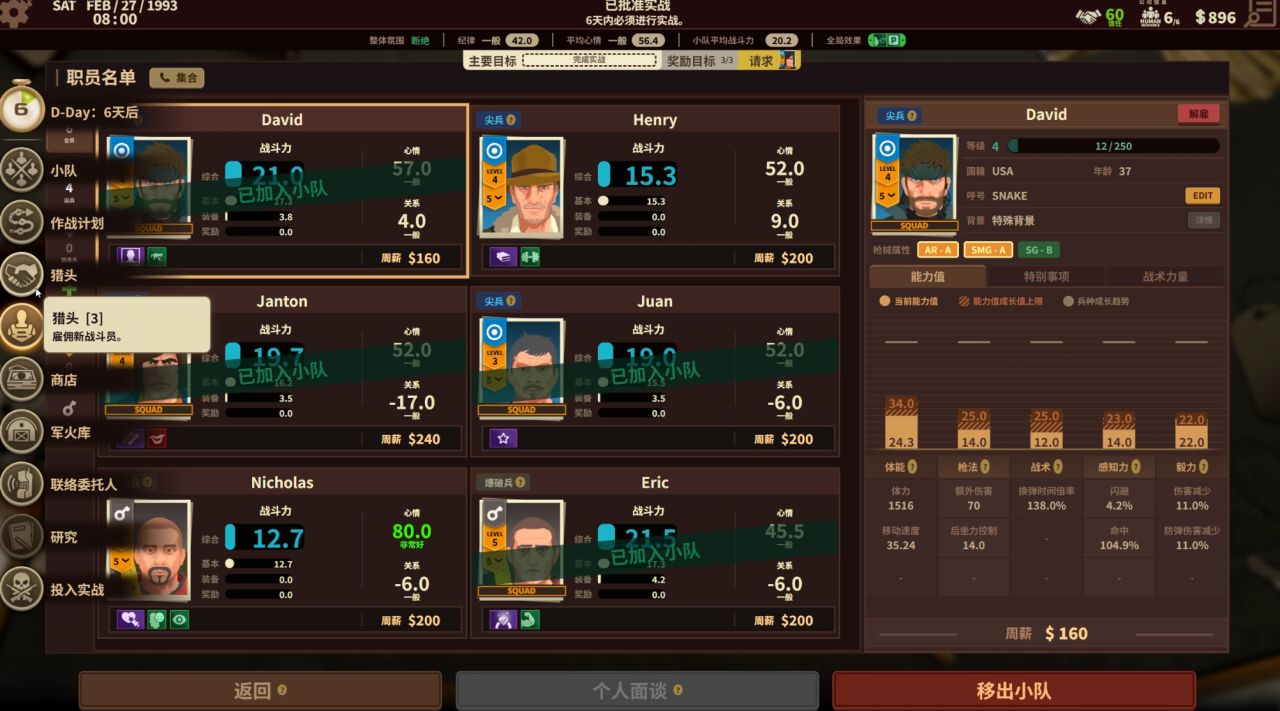 平常沒事情就喜歡在遊戲中管理和經營各種公司,狠狠教育和培養那些不聽人話的員工,盡情地過一把老闆癮。在這一個類型中較爲罕見的軍事僱傭兵題材,正好滿足了我對僱傭兵設定的好奇心。畢竟這次咱們不需要操控僱傭兵去戰鬥,只需扮演好老闆的角色,認真培養這幾位壯丁,監督他們完成一項項危險任務即可。