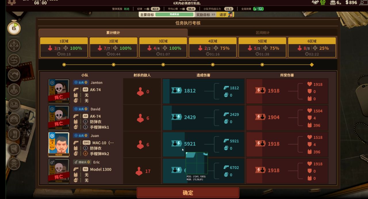 不過,在正式戰之中,由於我此前未能認真評估模擬戰的戰鬥成果,戰前因爲手快,忘記去裝配剛買的武器.......也沒有認真去調整隊伍戰術。所以,在第一個單子中,我軍損失慘重:三名隊友全部光榮犧牲,只剩下一位超雄哥,憑着最後一絲血量,把伐木場內的所有敵人全部殺光,僥倖地完成任務。