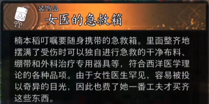 島國史上第一位女性西醫師,在遊戲中被描繪成一個擁有醫者仁心的角色。她在遊戲中的主要任務是與玩家互動,幫助玩家完成任務。