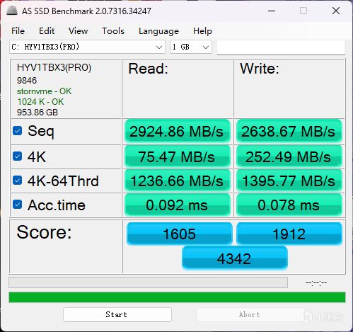 這裏翻譯一下,右邊的分別是 順序,4K, 4K 64線程,訪問時間,以及得分,目前來看得分爲4342,看上去它跟之前的偏差是不是有點大,實際上是因爲這個軟件很多年了,而且也沒怎麼更新過,所以數據會有點偏差來着。