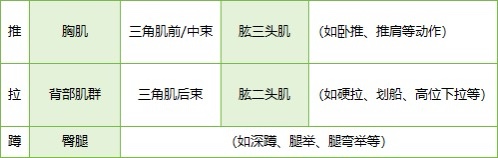 通常指將全身肌羣分爲「推」「拉」「蹲」三種動作模式每週循環訓練的方法。