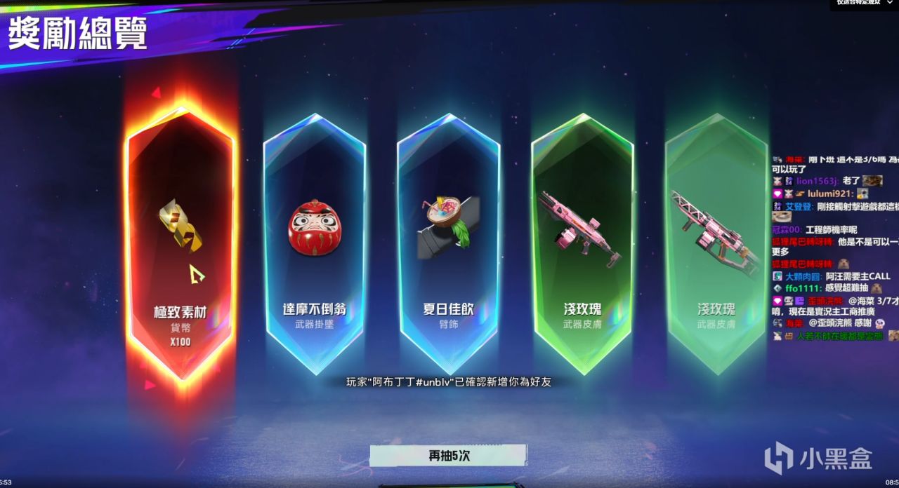 此外,紅色品質的獎勵終極材料可永久保留並跨獎池兌換獎勵,比例爲1000碎片換一個紅色品質皮膚。