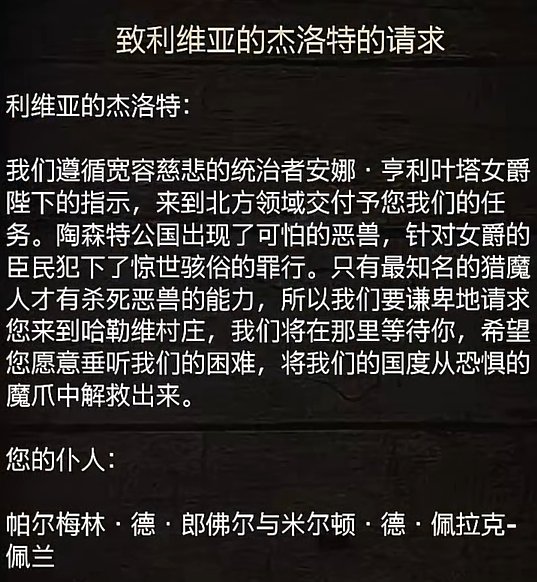 暮色籠罩下的威侖荒野,傑洛特於告示板前駐足,一紙鑲金紋章的委託書刺破陰霾——陶森特女爵的名號在羊皮捲上熠熠生輝。哈勒維村莊內,兩名外觀遠異與本地人的騎士自酒館陰影中現身:派爾梅林與米爾頓,其甲冑上的雕紋無聲昭示着來自南方公國的尊貴身份。他們以騎士禮相邀,帶領傑洛特前往公國。
