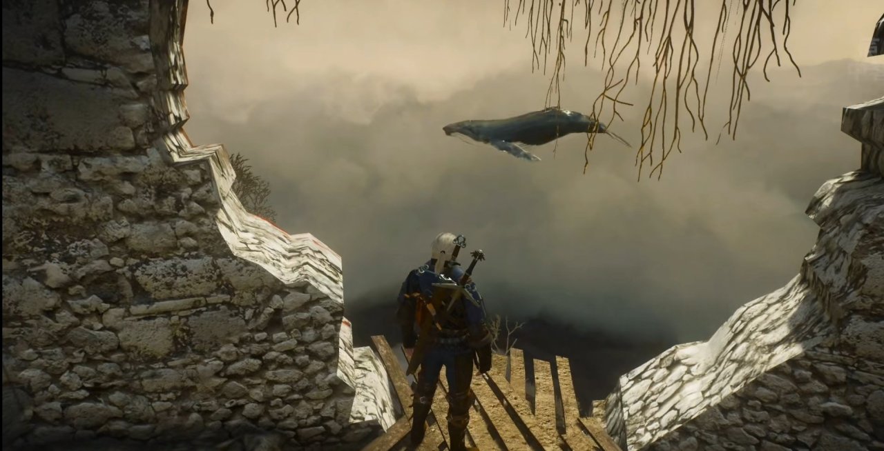 在打完雲巨人後,傑洛特走進城堡,而小門缺口後的虛空竟意外墜落了一頭鯨魚。