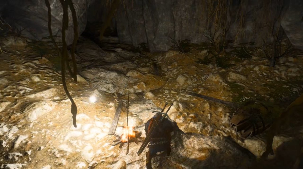繼續跟着它前進後,傑洛特被引導向了一個洞穴,而在洞穴裏,他見到了一座篝火。