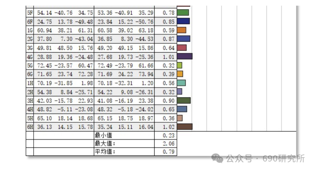 最大ΔE只有2.06,平均ΔE做到了0.79。要知道ΔE小於1.5的時候,對於我們人眼來說,色彩偏差幾乎就感知不到了, 而G24H3S經典版則是做到了0.79,這個色準表現可以說非常優秀了。