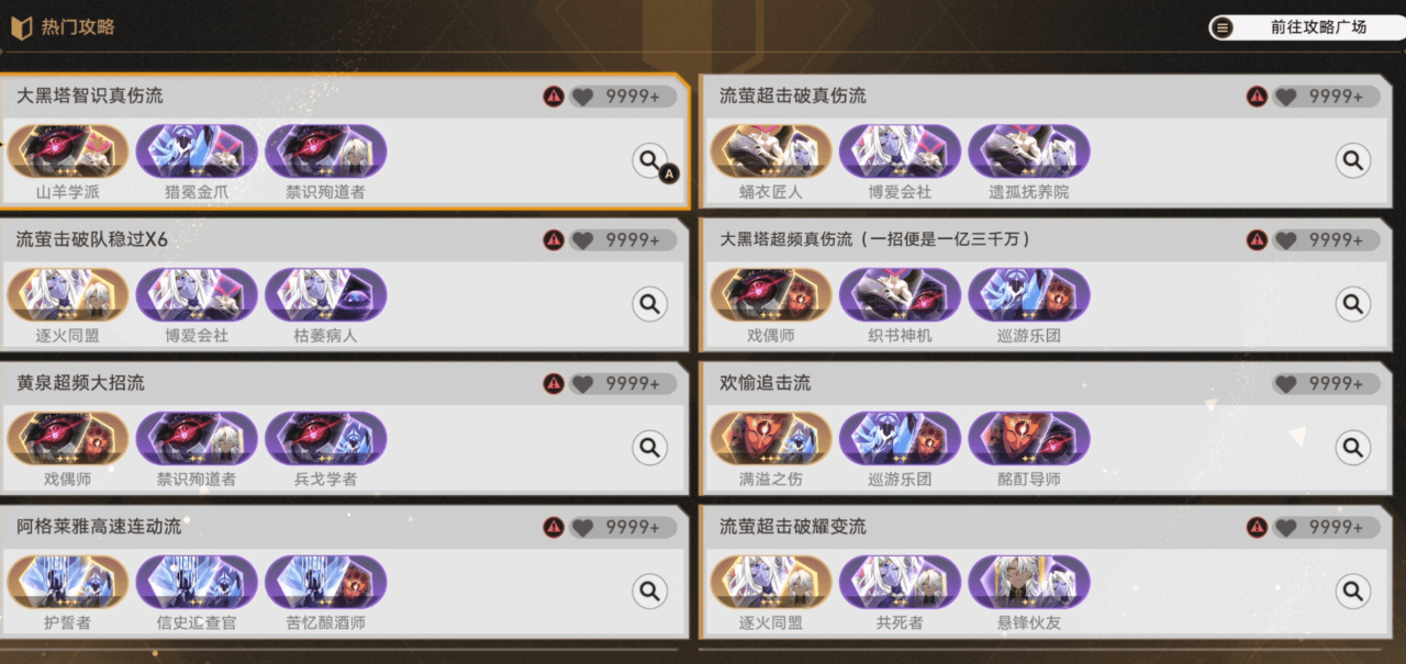 除了玩法內容上的更新,差分宇宙“千面英雄”還做了兩件事,一是爲像筆者這樣此前被精彩的劇情迷了眼,而忽略了差分宇宙玩法的萌新準備的內置攻略系統,這裏不僅有官方攻略,還有民間高手上傳的個人思路,我們可以根據自己的卡池情況,挑選有趣的配隊與增益組合來進行參考,輕鬆過關。