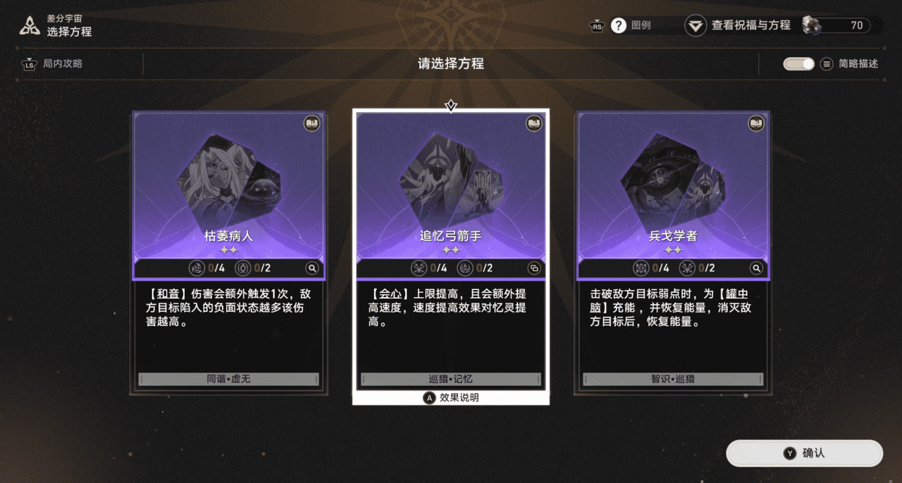 與模擬宇宙相比,差分宇宙不僅有更多的祝福、奇物種類,還新增了湊齊指定祝福即可觸發額外增益的方程系統,和對某類角色有特殊加成的加權奇物,讓玩家的增益搭配自由度大幅提高,每一局遊戲都能帶來差異化更大的新體驗。