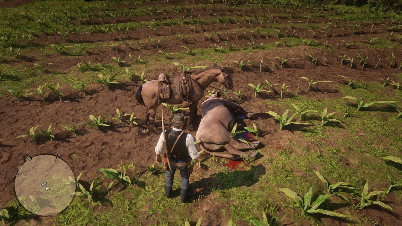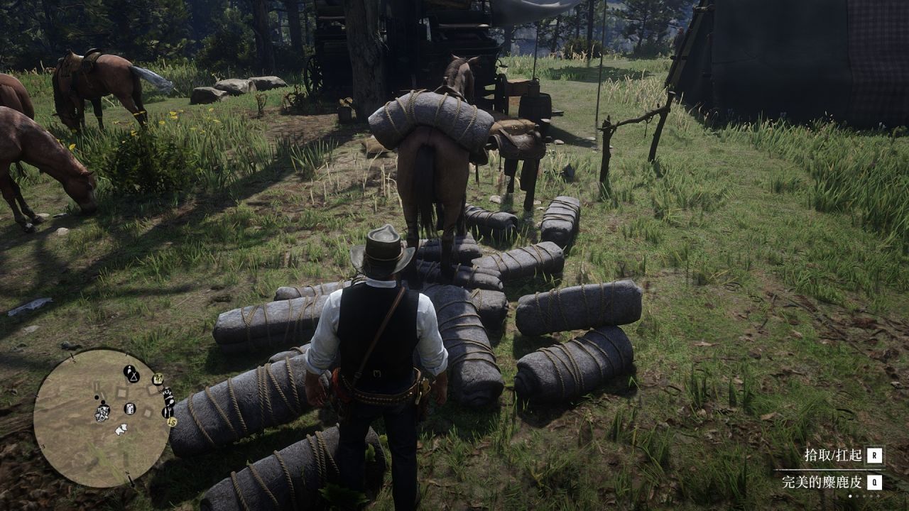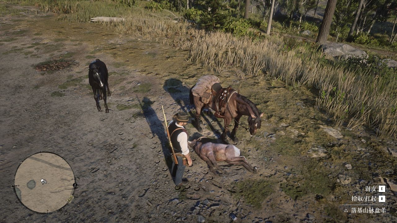 正常剝皮動畫,亞瑟會繞着屍體一圈。可以把馬停在屍體背面,卡住轉圈的身位,就可以達到快速剝皮的效果。如下圖,