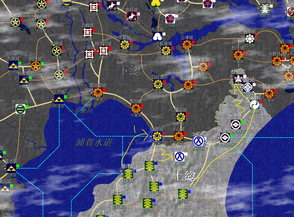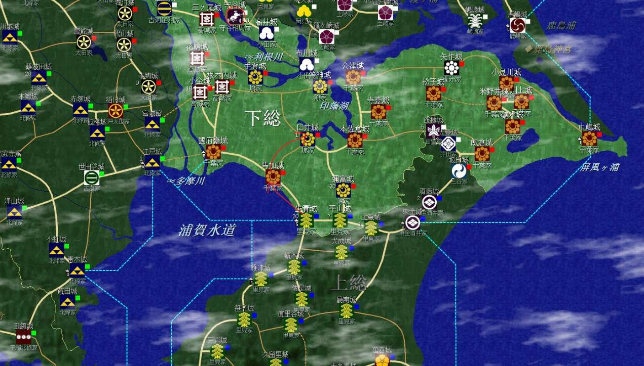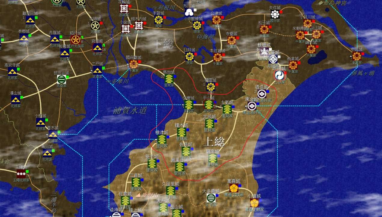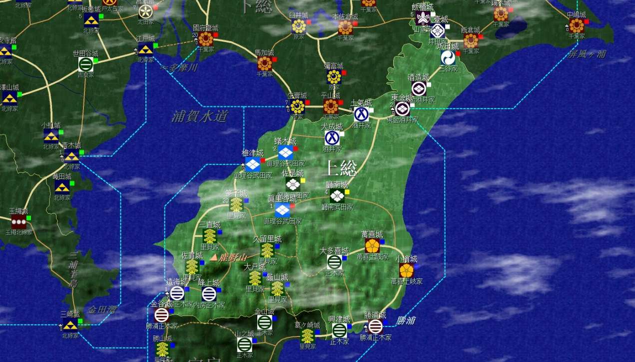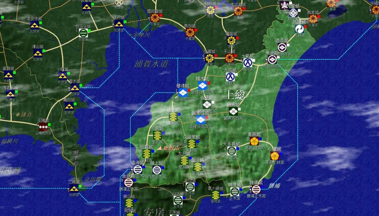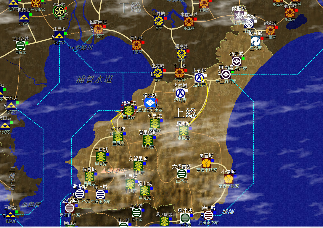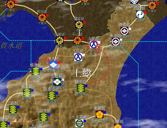 裏見家佔據了整個安房國(圖中不全)和上總南部,隔海與北條的相模相鄰,不過暫無後顧之憂;上總北部是真理谷武田及其分家,以及兩個酒井家,方便各個擊破;統一上總增加直轄領地是第一要務。