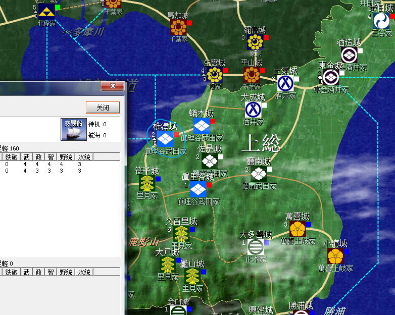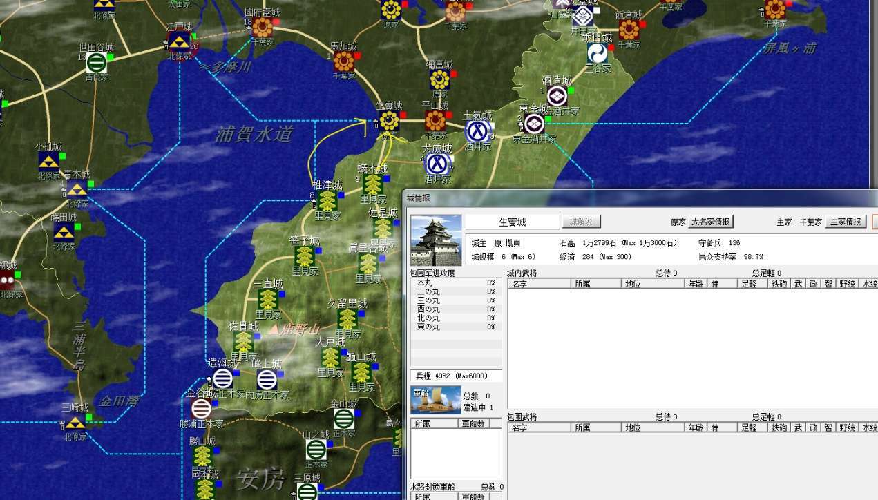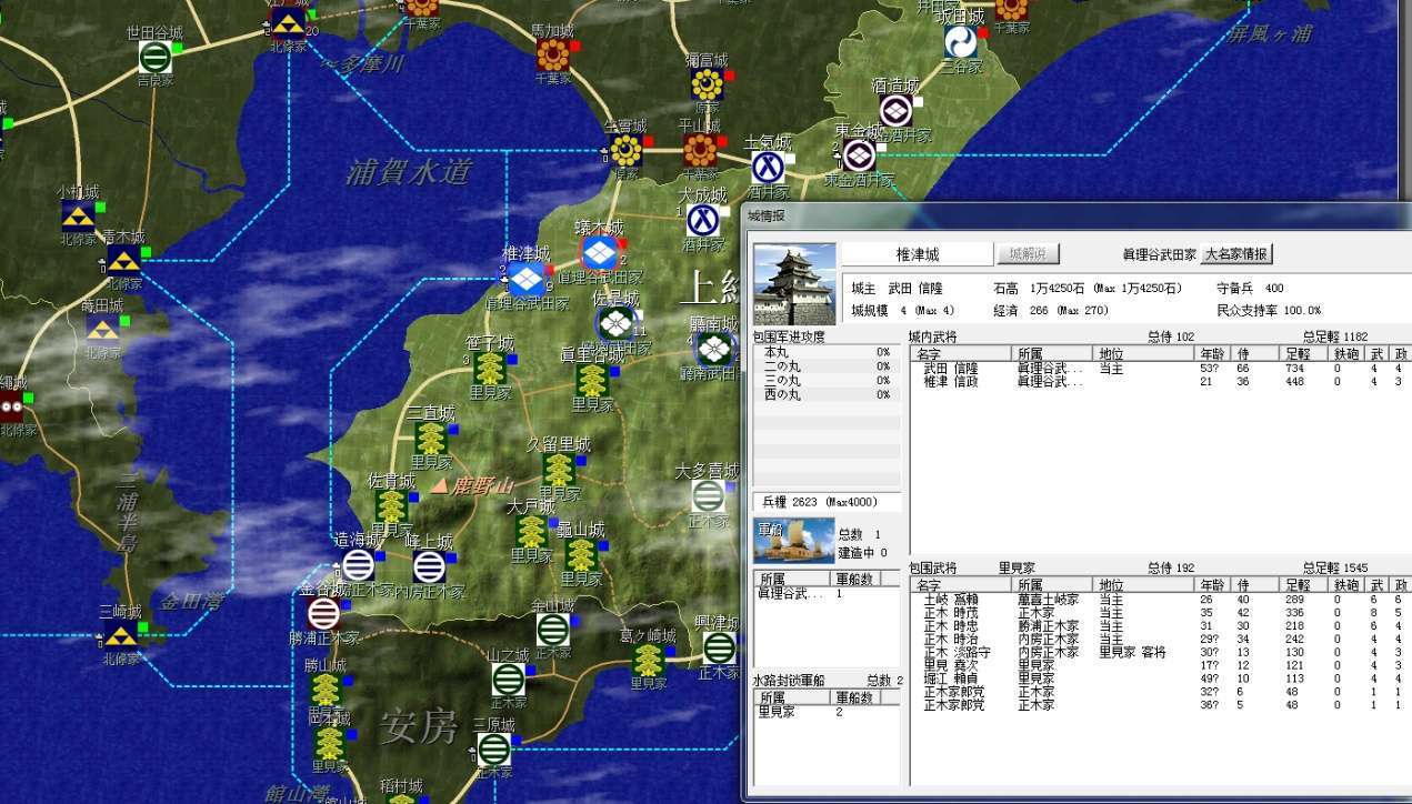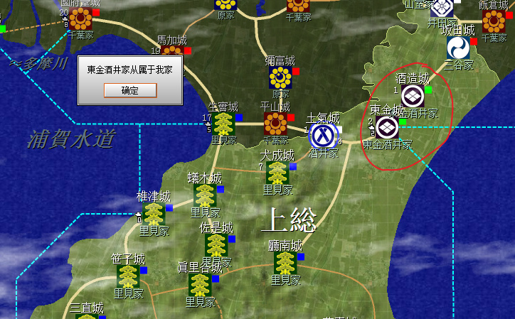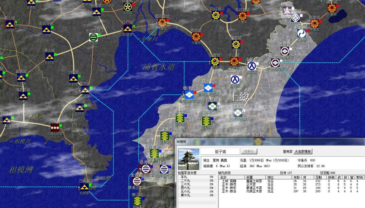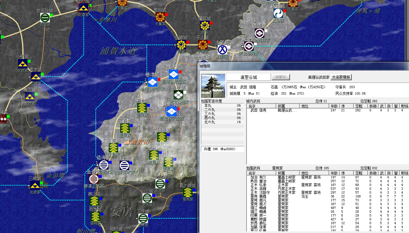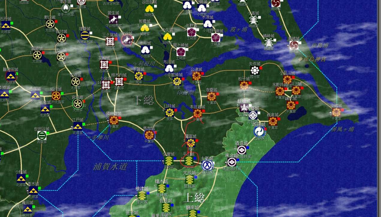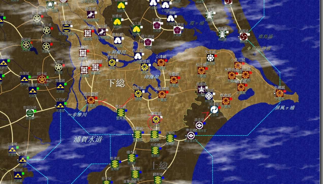 裏見家佔據了整個安房國(圖中不全)和上總南部,隔海與北條的相模相鄰,不過暫無後顧之憂;上總北部是真理谷武田及其分家,以及兩個酒井家,方便各個擊破;統一上總增加直轄領地是第一要務。