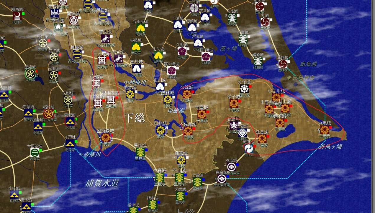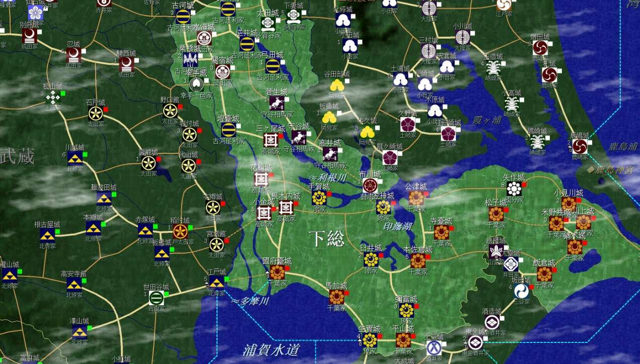 下總國是第二個目標,目前南部被千葉家佔據,千葉家會在江戶、國府臺與北條家死磕,可以乘虛奪取其領地,並且在合適的時機拿下國府臺城,關閉北條進入下總的通道。