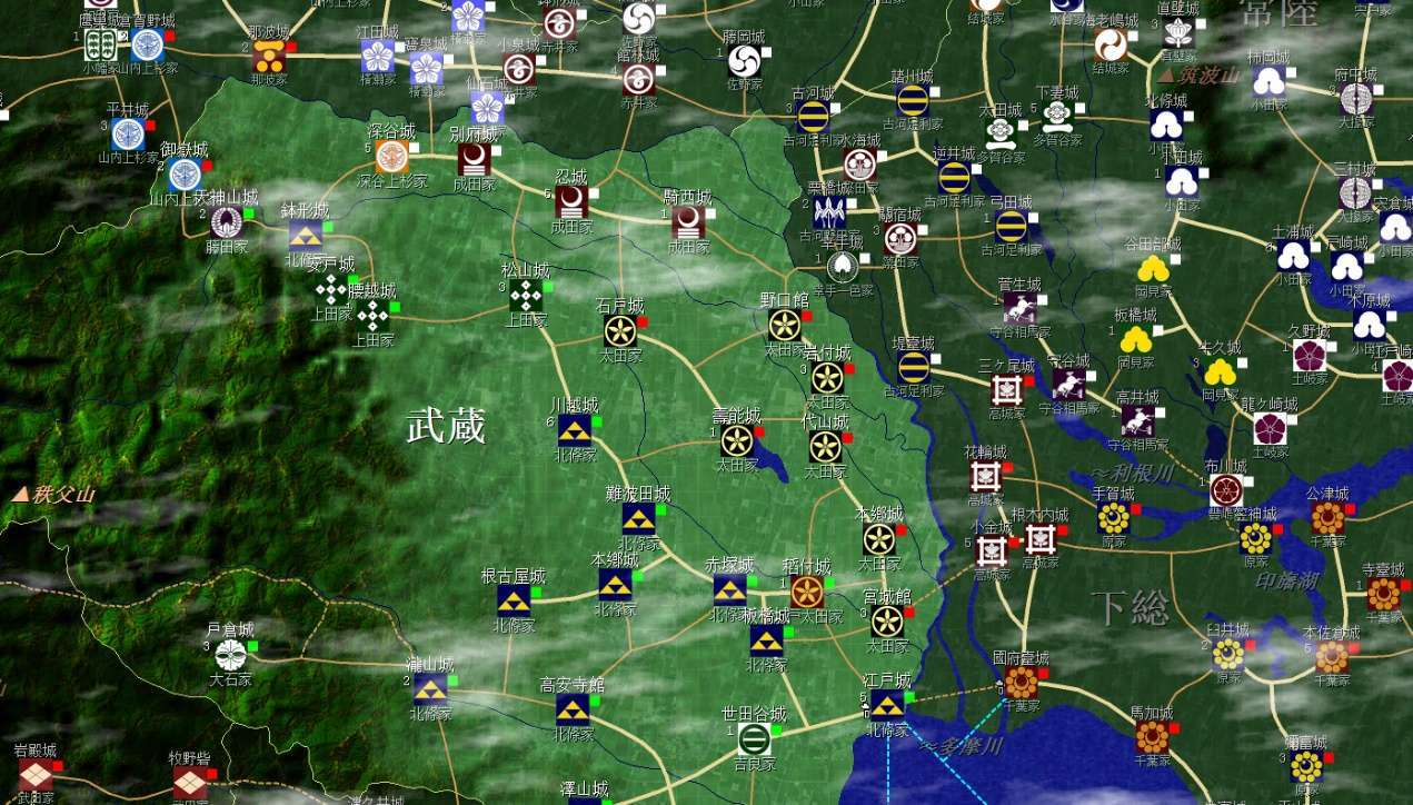武藏已被北條佔據大半,侵入武藏等於和北條全面開戰,預計1553年甲相駿同盟武田和今川退出包圍網後,北條就會發力統一武藏並進入上總、上野,屆時裏見家將視情況進入武藏或常陸干預。