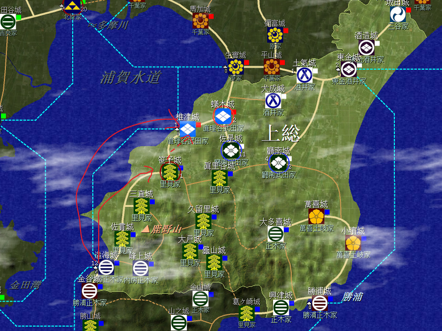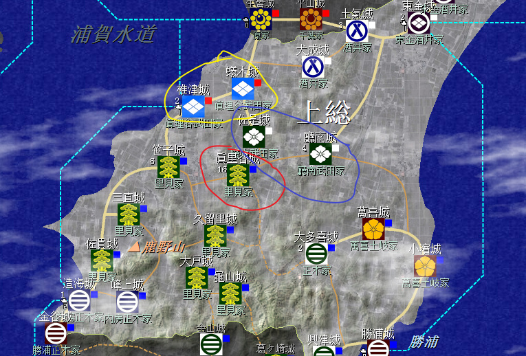 拿下真理谷城(圖中紅圈)後,斷絕廳南武田家的從屬關係,打算兩路圍城(圖中籃圈);先留着真理谷武田家(圖中黃圈)不打,一方面打下椎津城就和千葉家隔海相鄰,容易被打,另一方面也讓真理谷武田家再多招點兵,兵多幹殺快。