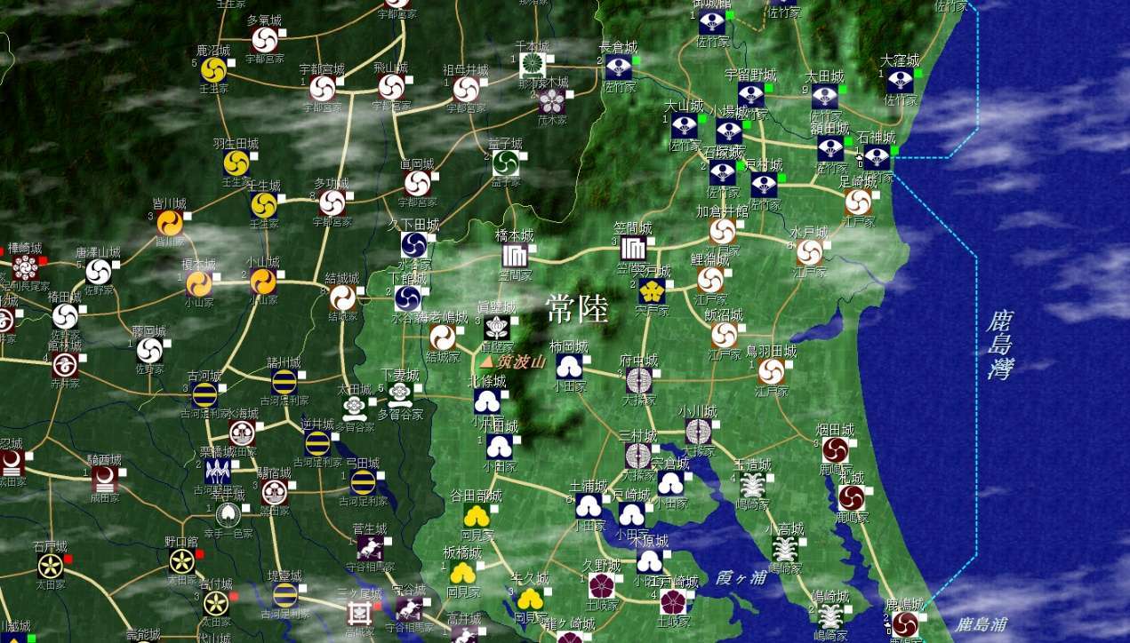 常陸小大名衆多,給了北部的佐竹家各個擊破的機會,佐竹和北條通常會成爲關東的兩大BOSS,需要時刻關注。但前期避免和佐竹直接接壤,有被北條、佐竹構建包圍網的可能。