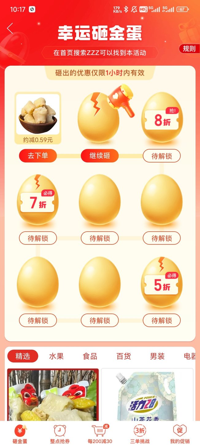 6.首頁中間砸金蛋,可以獲得想要的商品折扣,一般都是經常刷內容。
