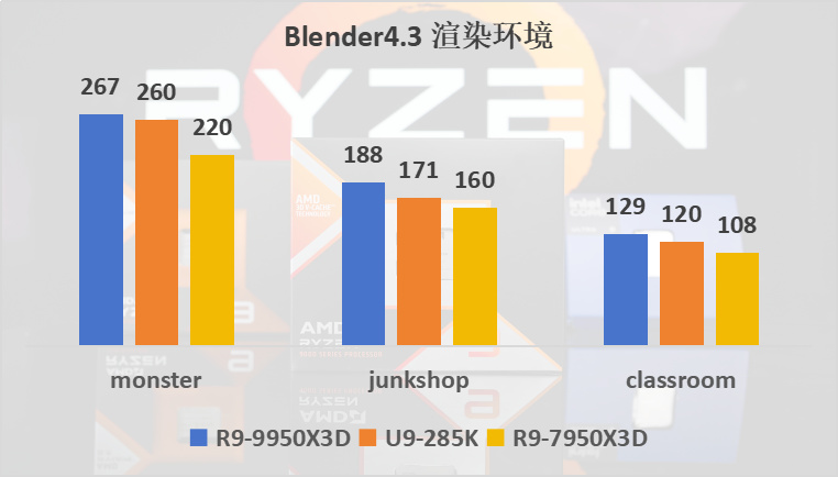 在Blender4.3渲染環境中平均領先285K 6%左右,能與7950X3D拉開20%的差距。