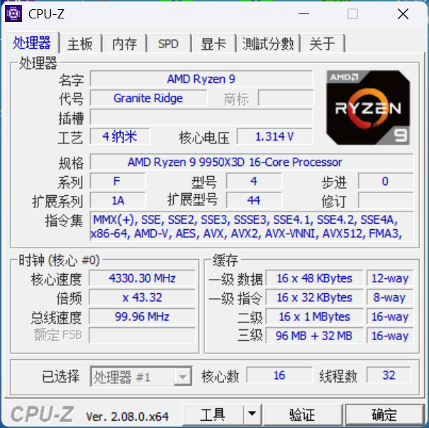 AMD銳龍9 9800X3D處理器採用臺積電4納米工藝,擁有16核32線程,基於最新的Zen 5架構,基準時鐘頻率4.3GHz,最大加速時鐘頻率5.7GHz,三級緩存128MB,TDP功耗170W。相比7800X3D基礎時鐘頻率提升了0.1GHz,功耗提升了50W,這也是得益於第二代3D V-Cache技術。