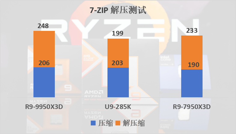 在7-ZIP解壓測試中尤其是解壓縮上更是遙遙領先285K,平均領先7950X3D 7%。