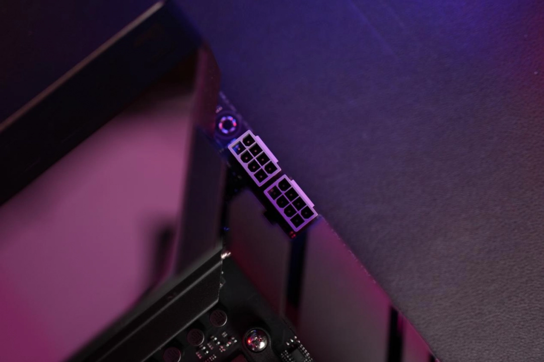 供電方面依舊是16pin的12V-2×6接口,但是進行了反向設計,更方便插拔並配有指示燈,可通過燈光顏色判斷供電線是否正確連接。接口也經過鍍金處理,導電性更好更耐腐蝕。供電接口左側是幻光同步接口,通過線纜將顯卡連接主板的ARGB接口,可由主板統一控制顯卡和其他硬件燈效,實現整機燈光同步。