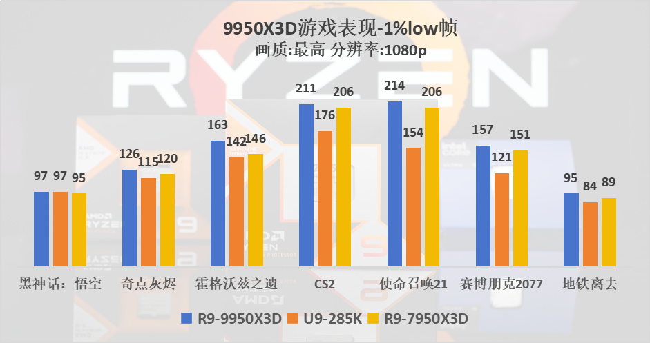 1%low幀是將幀數從大到小進行排序後取最後的1%。1%low幀更能體現穩定性,體現遊戲的流暢度與卡頓情況,數值越接近平均幀越好,9950X3D依舊能分別領先285K和7950X3D 18%和5%左右。