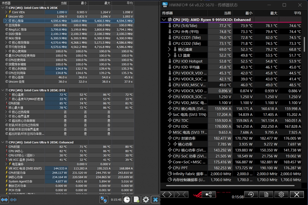 最後我們還進行了一下烤機測試,牙膏倒吸的285k或許唯一的優勢就是功耗低,但是在CPU滿載的環境下真的如此嗎?就如前面所說,渲染環境下,CPU負荷極大,而285k在滿載狀態下功耗來到了245W,CPU核心溫度72度。不過9950X3D卻要冷靜很多,功耗182W,核心溫度69度。