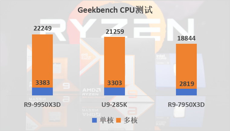 先來看Geekbench的CPU測試,AMD銳龍9 9950X3D處理器不僅在單核性能上領先了285K 2%,更是在多核性能上領先了大約4%,實現了對競品最強生產力的強勢打擊。而對比上一代銳龍9 7950X3D更是有着20%的領先幅度。