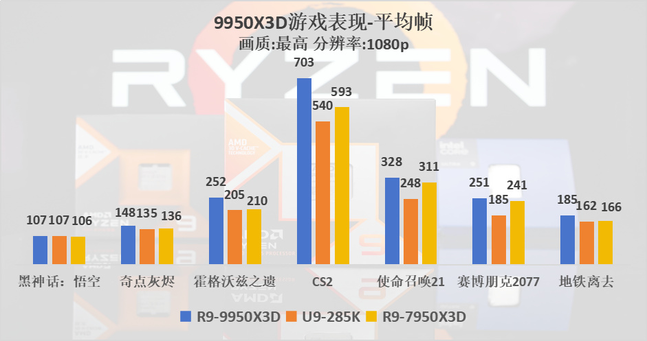 接下來再來看一下游戲測試,在1080P分辨率下,畫質設爲最高。9950X3D平均領先285K20%左右,領先上一代的7950X3D大約10%。在《賽博朋克2077》以及《使命召喚21:黑色行動6》上都表現不俗,遙遙領先285K超30%的性能,也小幅領先7950X3D。最令人驚訝的就是CS2的成績了,足足領先了285K 30%,通常在競技網遊上比較喫CPU的三級緩存,三級緩存越大,數據訪問速度越快,也正是因爲144MB的超大三級緩存的加持,讓9950X3D擁有了卓越的遊戲表現。
