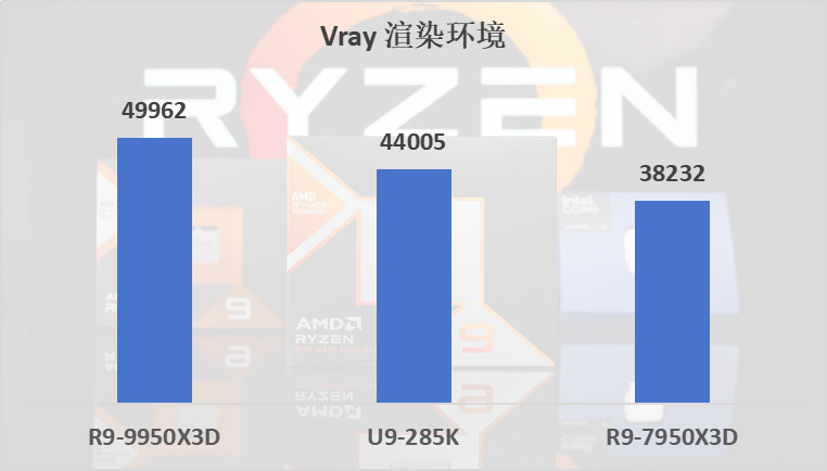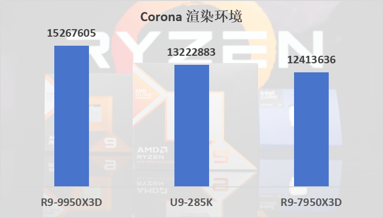 在chaos的兩項渲染測試中,Corona benchmark上領先285K 15%,7950X3D 23%。Vray benchmark上領先285K 13%,7950X3D 30%