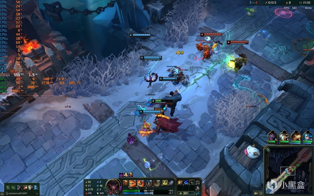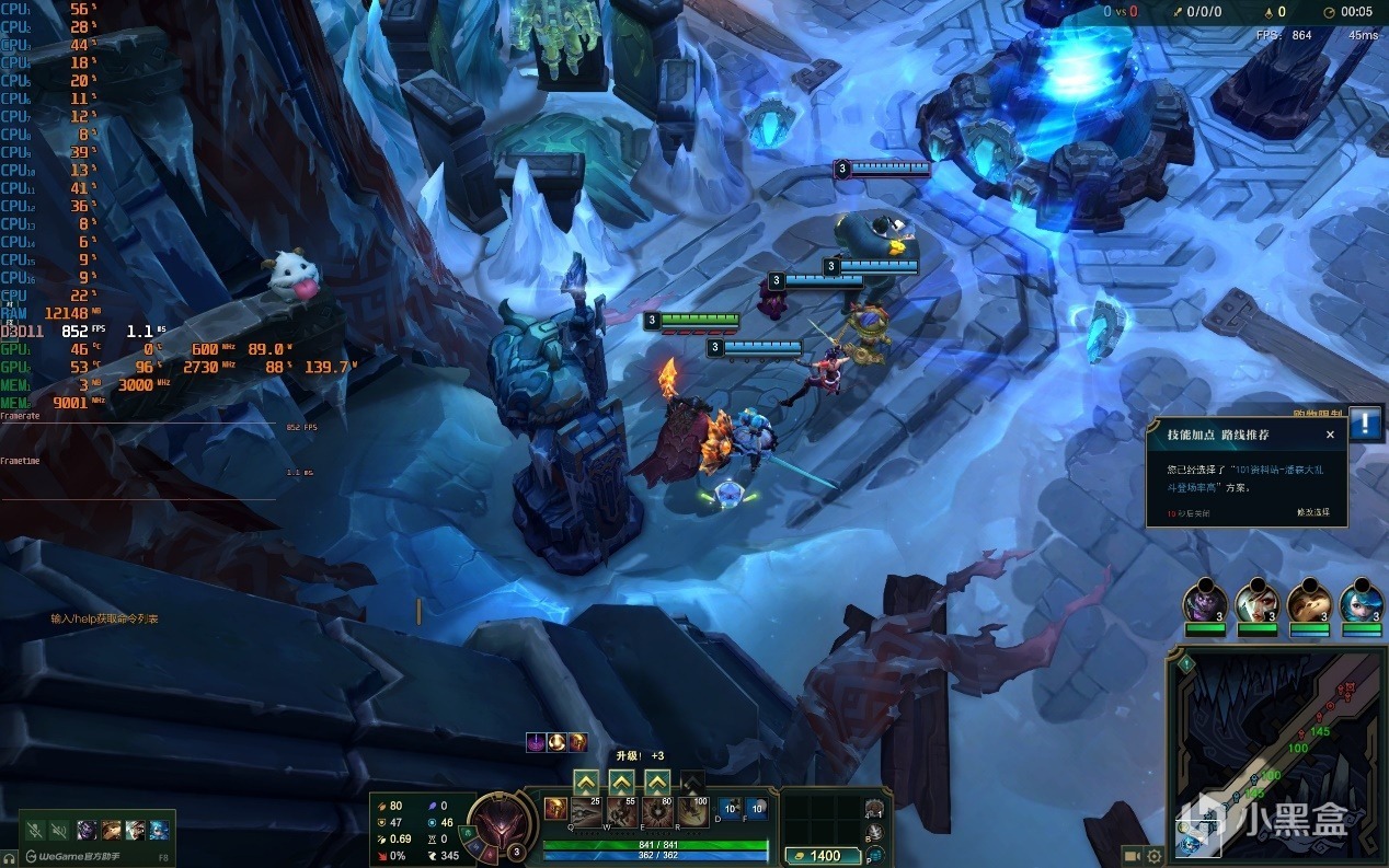 ▼LOL大亂鬥模式,2K分辨率,全極高畫質,泉水遊戲幀數在852幀左右,非常流暢。