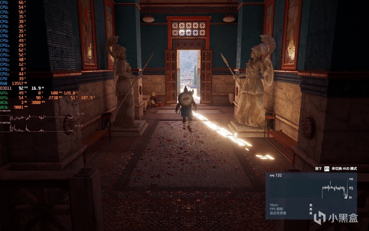 ▼終生平等奧德賽,2K分辨率,全極高畫質,體積雲最低,走廊遊戲幀數在92幀左右,還可以。