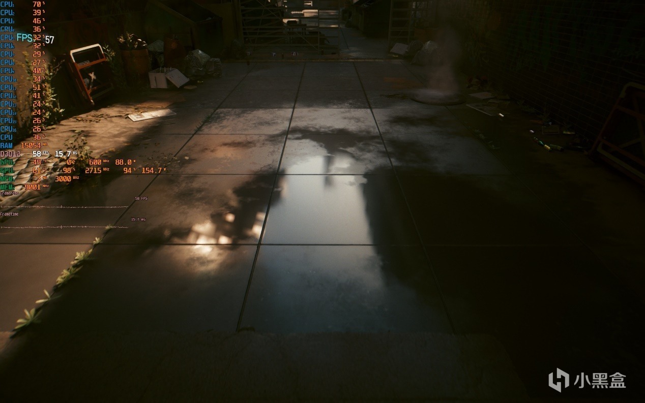 ▼室外水灘的倒影很真實,遊戲幀數在58幀左右,顯卡的核心頻率在2715MHz左右,功耗155W左右。