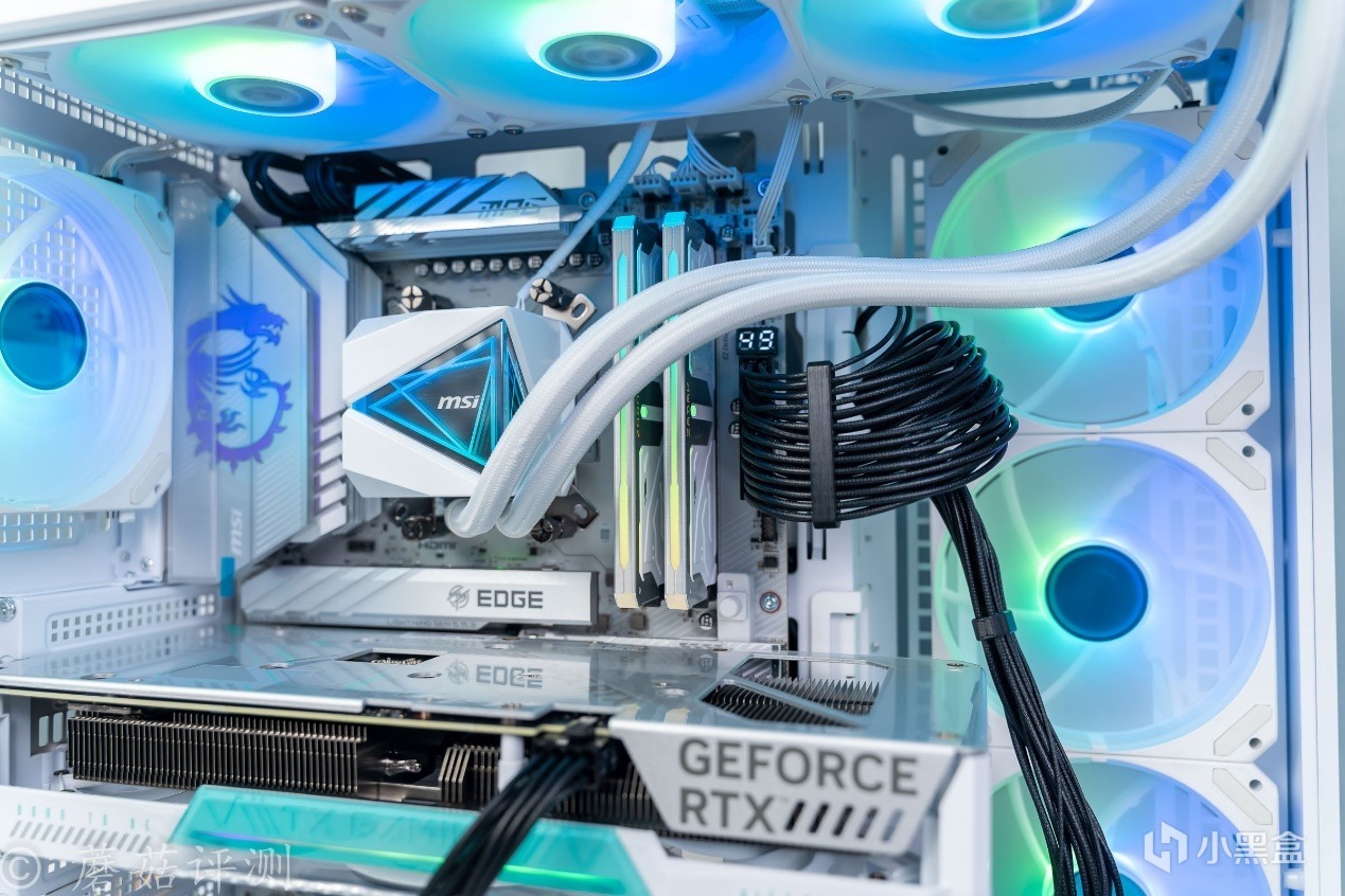 ▼水冷用的是微星的MAG CORELIQUID I360 WHITE寒冰,這款水冷的水冷頭採用雙面無限鏡設計,支持ARGB燈效,視覺觀感很漂亮。
