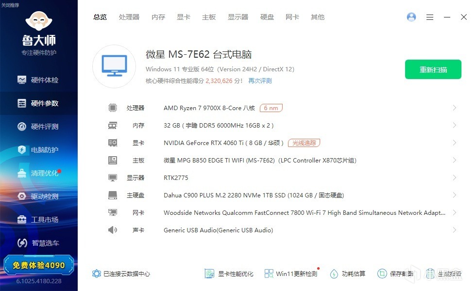 ▼整機配置一覽,處理器是9700X,顯卡是華碩的天選RTX4060Ti。