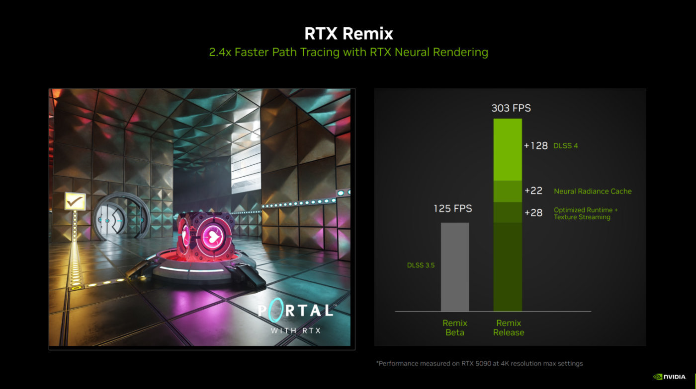 DLSS 4加入的RTX Remix可以讓遊戲不僅獲得更好的畫質,遊戲幀率也隨之顯著提升。比如《傳送門RTX》中,大量的遊戲幀率提升來自DLSS 4,還有RTX神經輻射緩存等等。