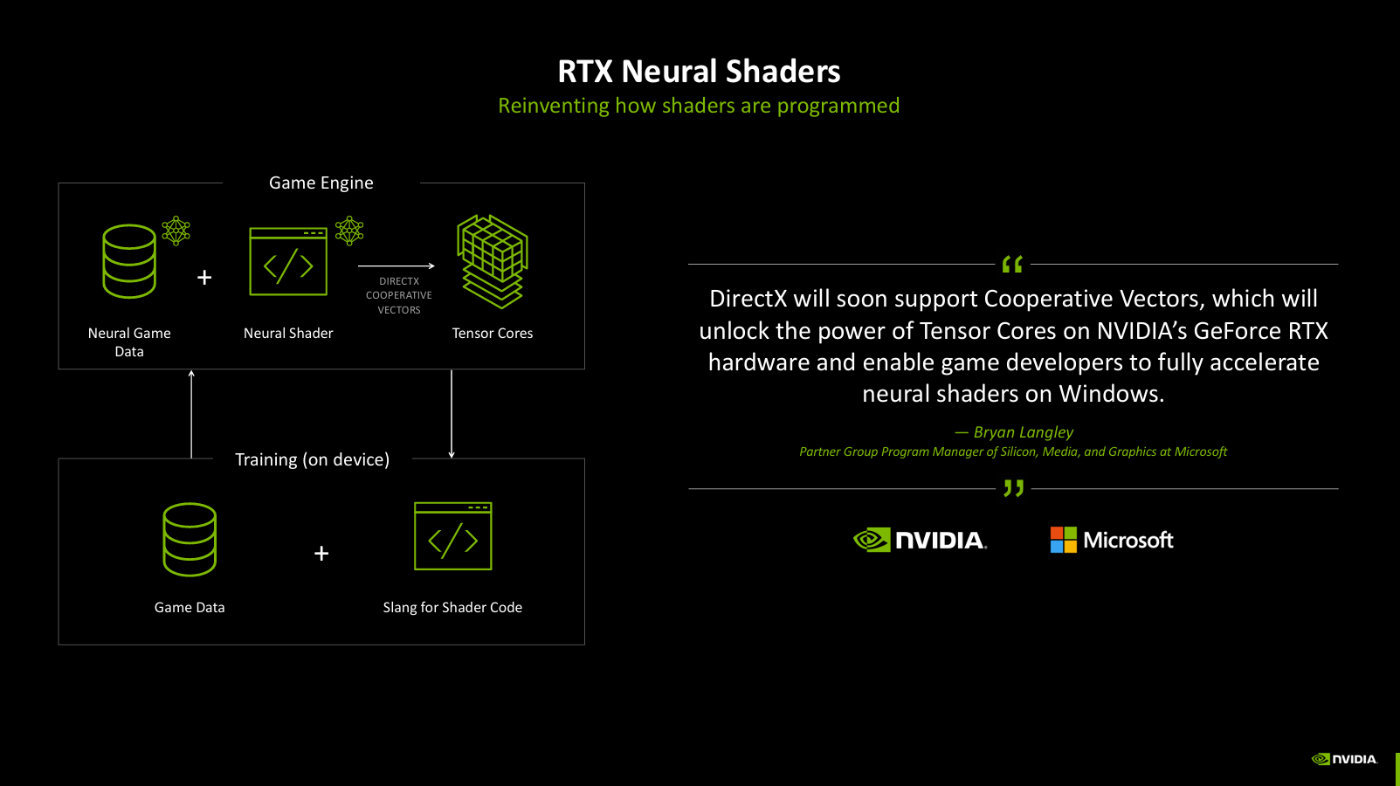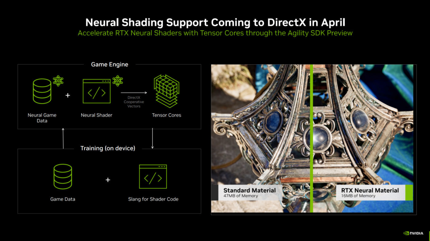 GeForce RTX 50系列GPU推廣加速的同時,與之對應的DLSS 4,AI神經渲染和神經着色技術也得到快速普及。就在此刻,英偉達正式在Game Developers Conference 2025(GDC2025)上宣佈NVIDIA RTX神經渲染技術得到了新的進展,這一次,微軟DirectX也加入其中,宣佈4月份DirectX預覽版就會加入神經着色支持。意味着,將會有更多的遊戲製作團隊可以輕鬆通過DirectX調用GeForce RTX中的Tenor Core和對應的AI功能。