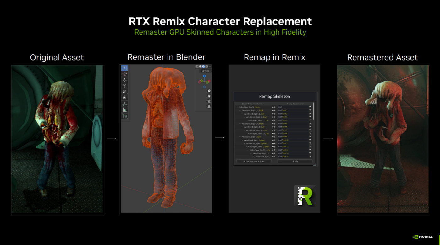 在RTX Remix中,通過Remap in Remix技術,可以讓模型更快的匹配更合適的素材,從而高效的實現遊戲MOD重建工作。