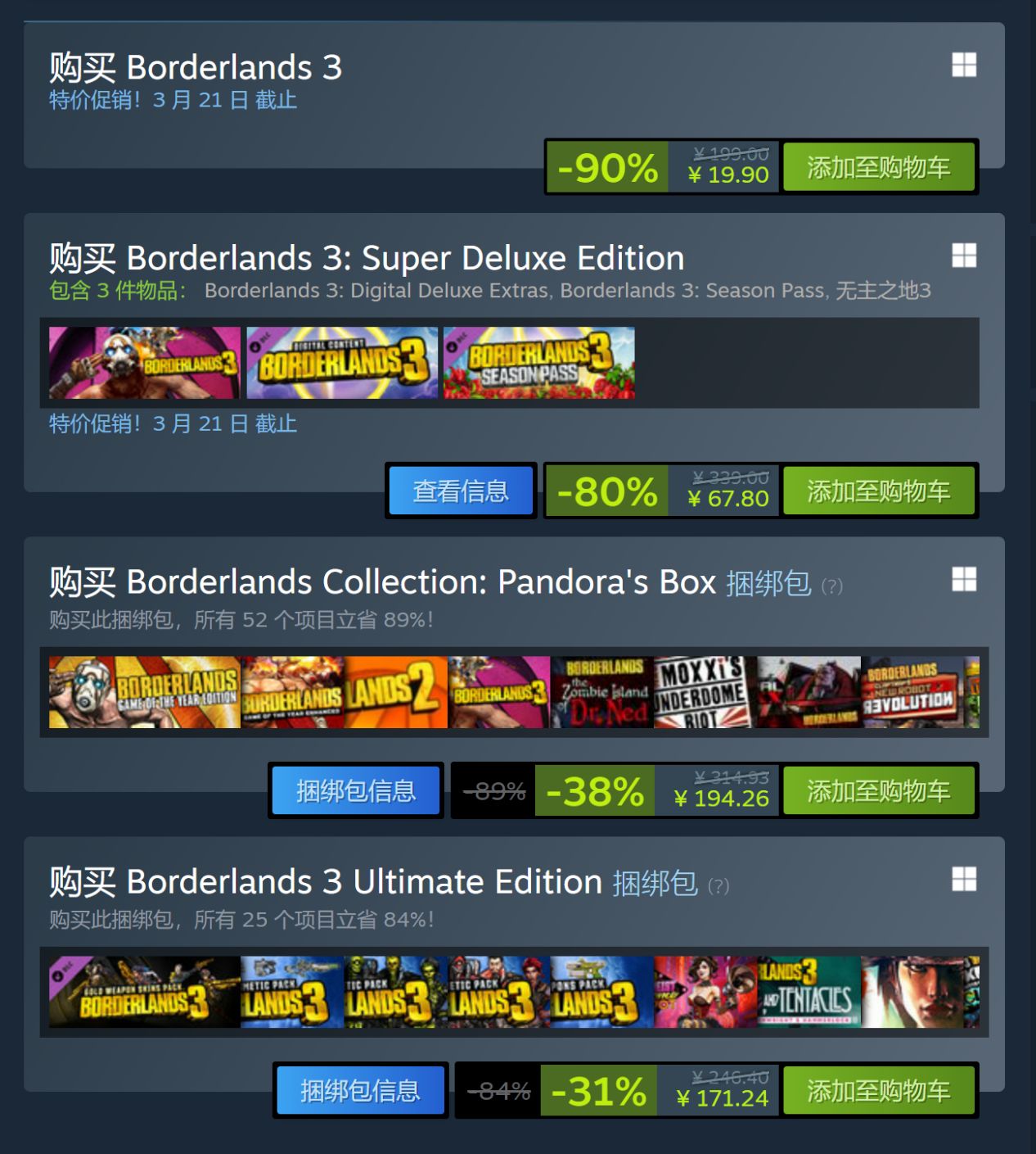 不過《無主之地4》畢竟還有半年時間才發售,如果你聽說過《無主之地》系列但沒玩過前作《無主之地3》,那麼可以趁春促來入手了。因爲在本次Steam春促期間,《無主之地3》的折扣力度達到了-90%OFF,二十塊錢不到的折後價,可以說是“打骨折”了。