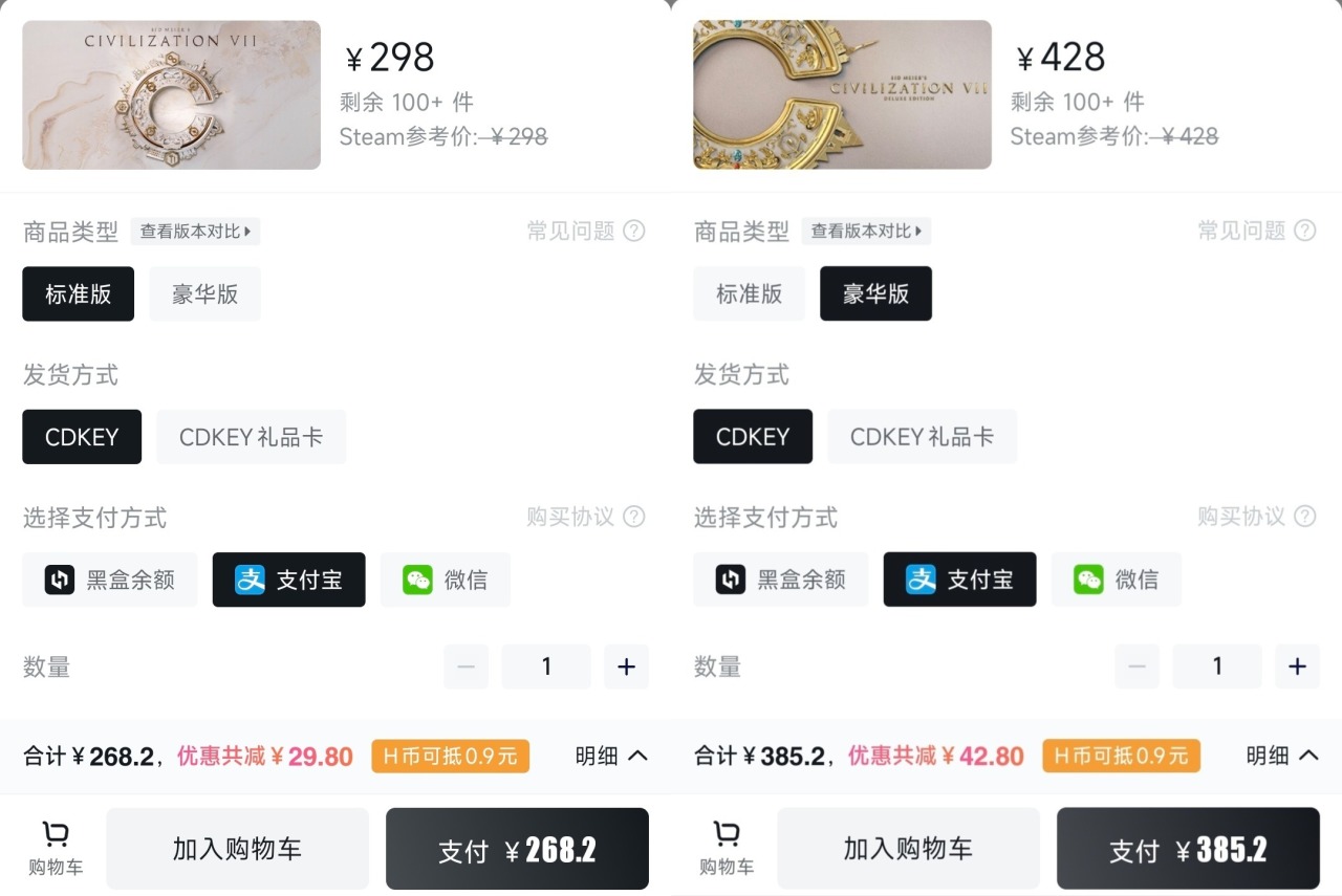 《文明7》豪華版原價428元,在小黑盒領券之後只需385.2元。