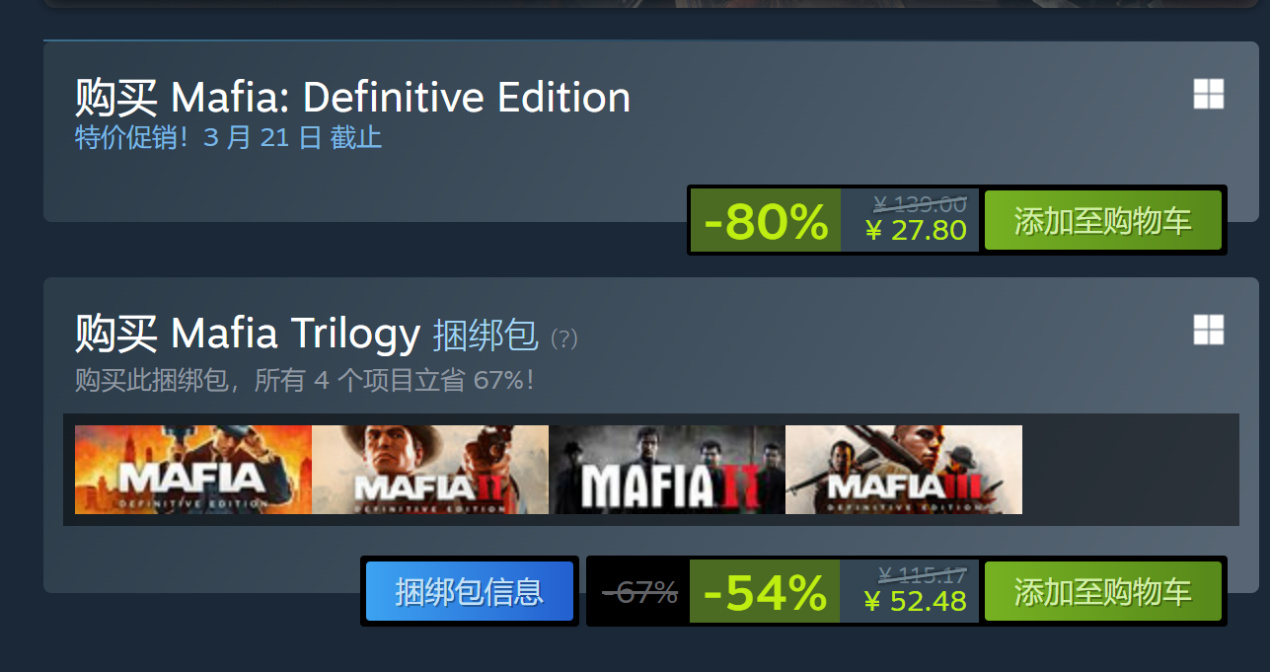 黑幫題材佳作《四海兄弟: 最終版》這次春促也有非常大的折扣力度,-80%OFF,原價139元,折後僅27.8元。另外還有一個《四海兄弟》三部曲的合集,價格也是比較不錯的。