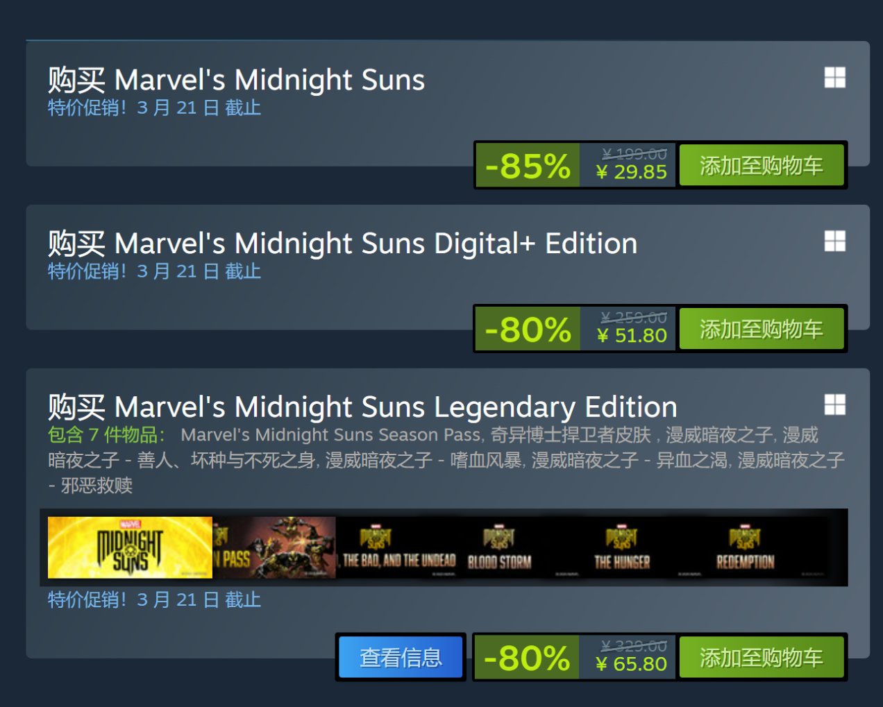 《漫威暗夜之子》標準版即本體的折扣達到了-85%OFF的力度,折後價29.85元,如果感興趣的話可以入手本體來玩玩,個人覺得這個價格的性價比是非常不錯的。