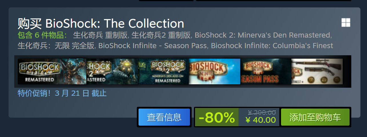《生化奇兵》系列的每一部都分別在春促期間有打折。不過,如果你的Steam庫裏目前還沒有這個系列的任何一部,那麼我強烈推薦你直接入手《BioShock: The Collection》這個包含全部1、2、無限的豪華版捆綁包。