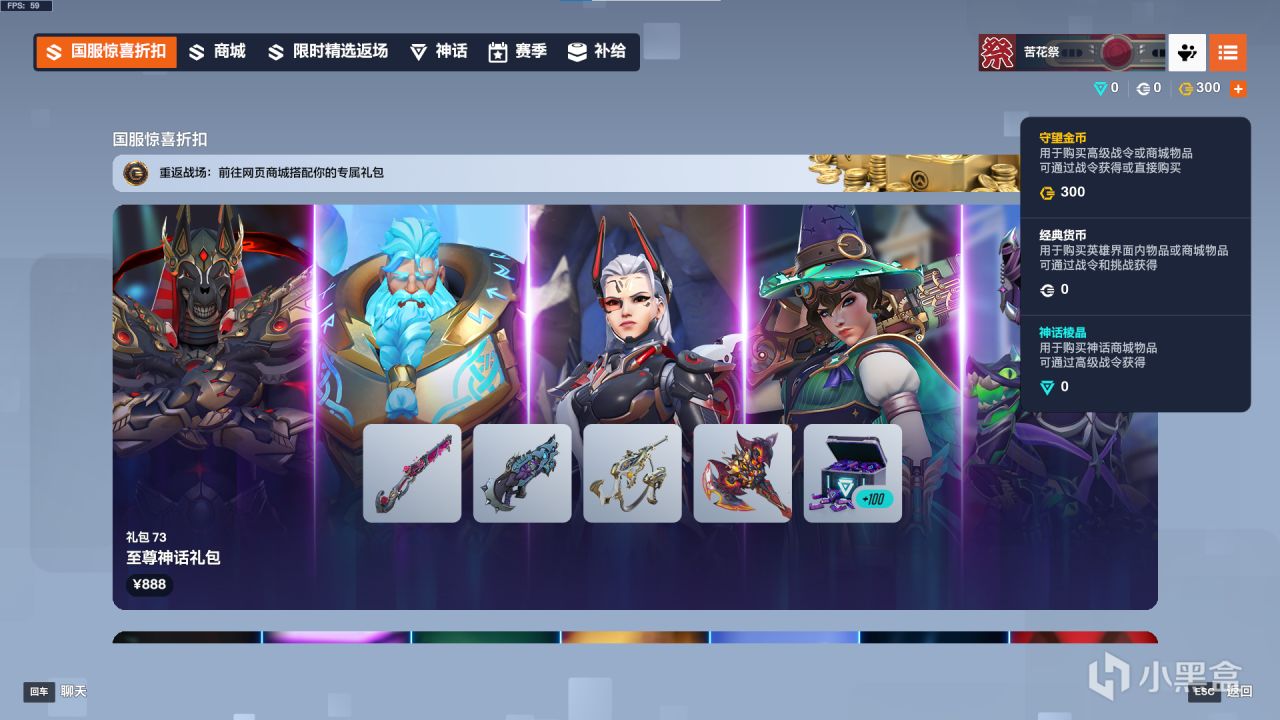也可以在商城內直接購買888塊的神話皮膚大禮包,包含一些神話皮膚和神話棱晶,但價格也不是大多數人能購買的