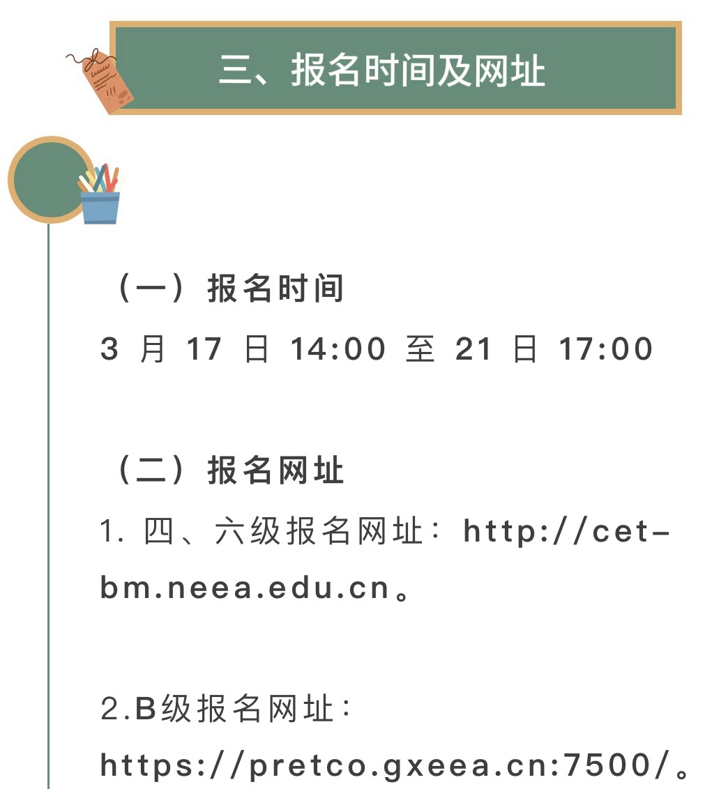 • 報名時間:通常爲3月19日至25日,但各地報名時間有所不同。各地考生需按所在學校規定時間登錄CET全國網上報名系統完成資格審覈、筆試報名繳費及口試報名繳費。