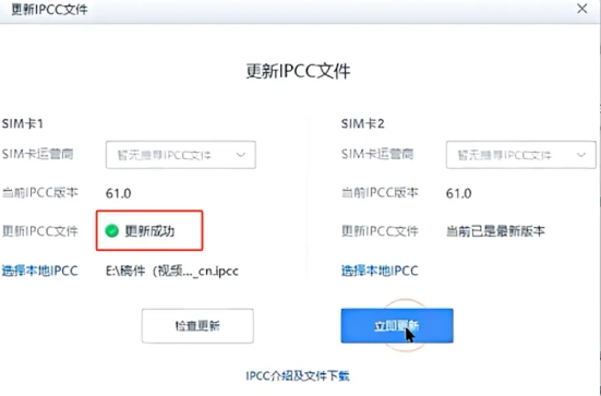 更新成功後,[當前IPCC版本]這裏會顯示更新成功,* 如果你是雙卡用戶,則需要更新兩次IPCC文件。