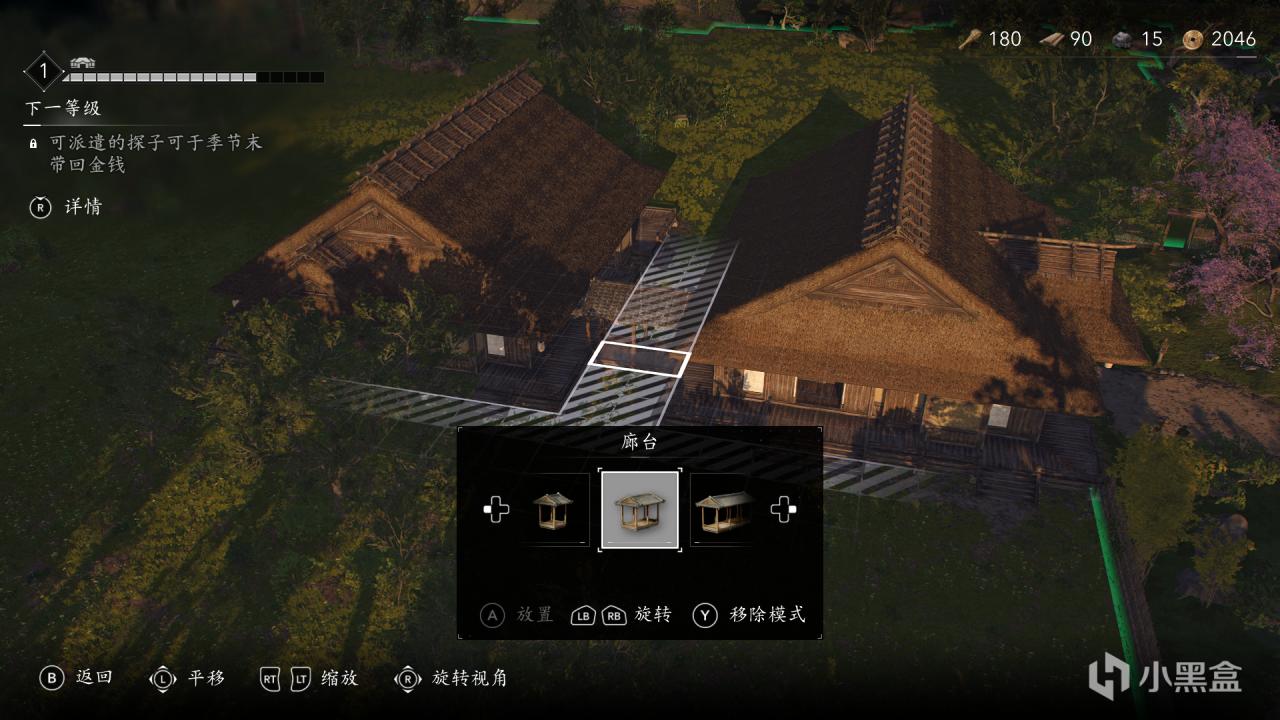 雖然這套系統在《刺客信條3》和《英靈殿》裏都算是已有先例,不過《影》提供的是一種自由度更大,也更具成長性的家園營造:你可以自由擺放各種功能性建築在家園中的位置,自由地拼接廊臺來進行貫通,自由地設計各種景觀,放置各類寵物來讓據點變得更美。
