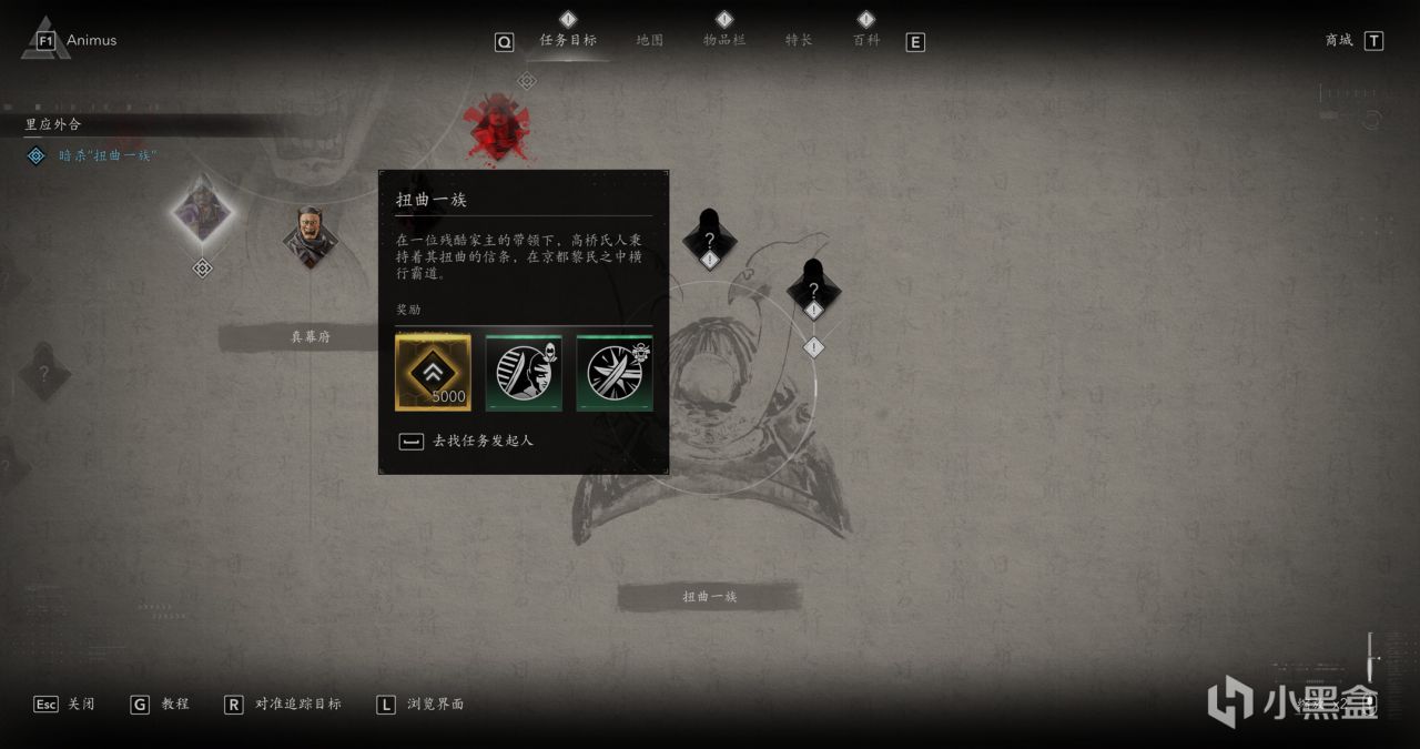 丟失的信任務結束,下一個任務裏應外合,地點在京都東部的會丘,傳送回東寺,前往清水寺,與氏政互動,他告訴我們要去暗殺扭曲一族,新環已經在任務面板更新,去做新任務前,把氏政旁邊的鳥瞰點開了。